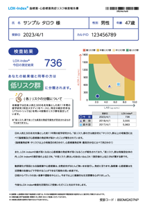 わかりやすい評価と、生活習慣改善のアドバイスが記載されています。また過去の結果も表示されますので、定期的に検査を受けると以前との変化を評価できます。